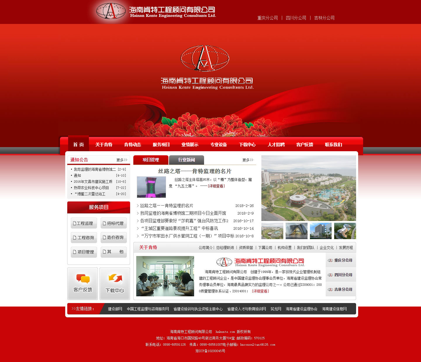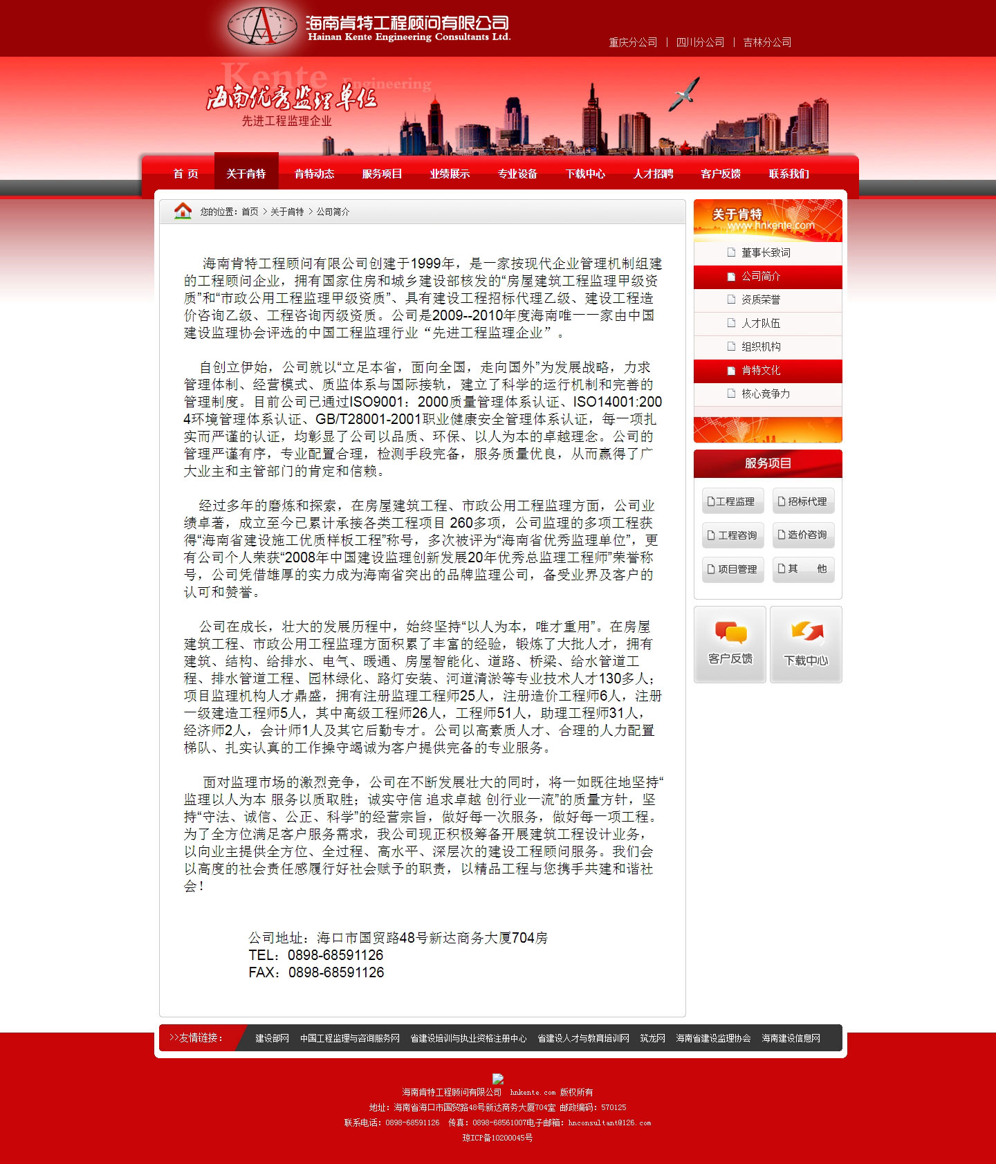 海南肯特工程顾问有限公司创建于1999年,是一家按现代企业管理机制组建的工程顾问企业,拥有国家住房和城乡建设部核发的“房屋建筑工程监理甲级资质”和“市政公用工程监理甲级资质”、具有建设工程招标代理乙级、建设工程造价咨询乙级、工程咨询丙级资质。公司是2009--2010年度海南唯一一家由中国建设监理协会评选的中国工程监理行业“先进工程监理企业”。