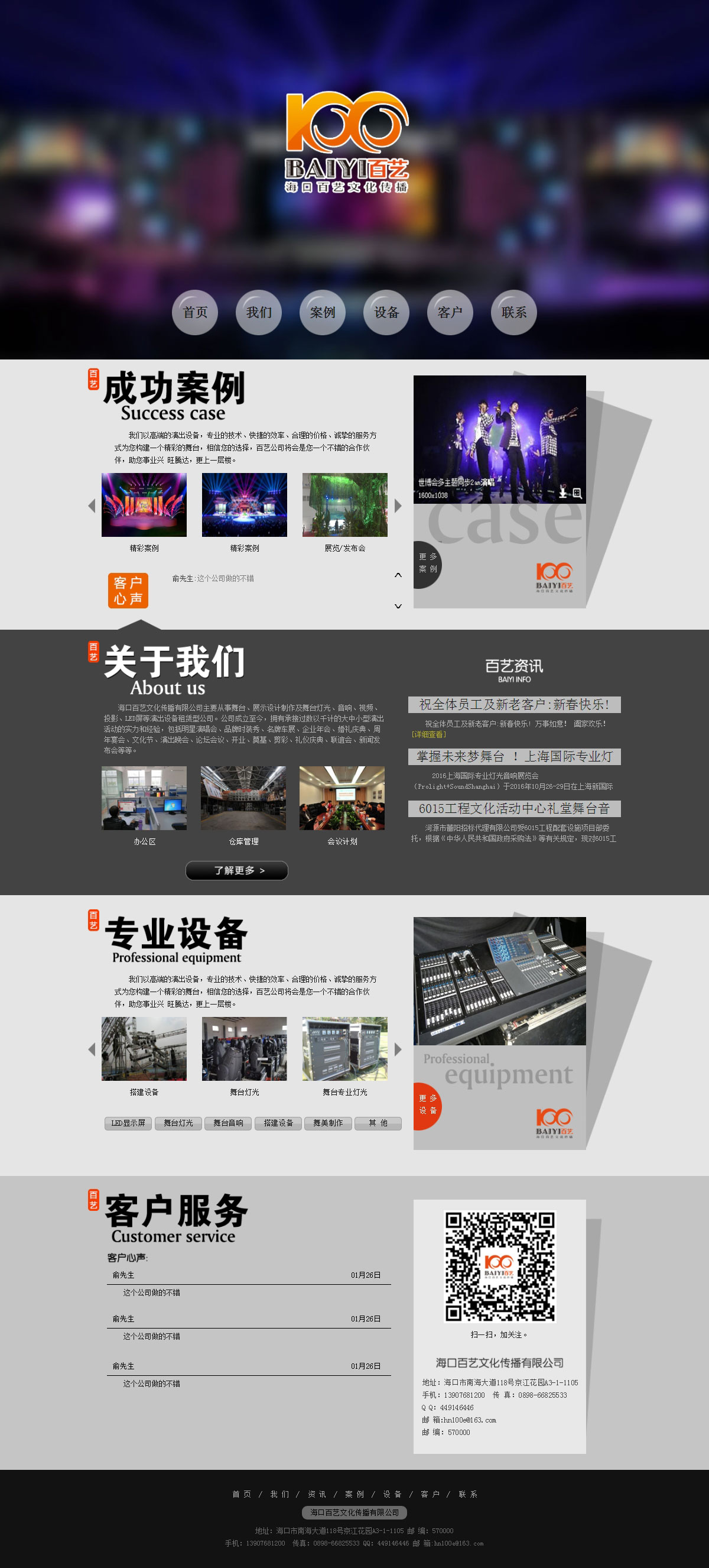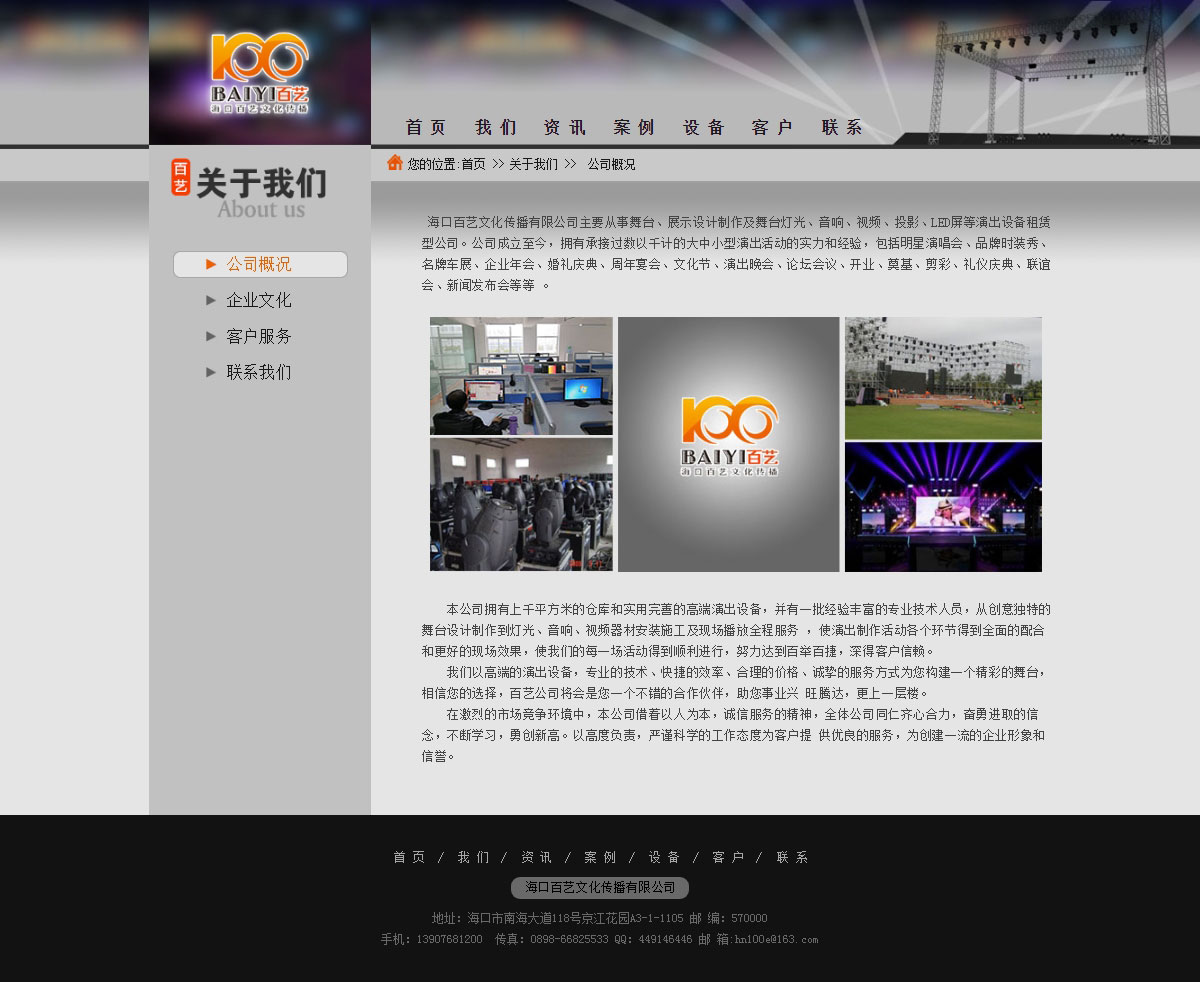 海口百艺文化传播有限公司主要从事舞台、展示设计制作及舞台灯光、音响、视频、投影、LED屏等演出设备租赁型公司。公司成立至今,拥有承接过数以千计的大中小型演出活动的实力和经验,包括明星演唱会、品牌时装秀、名牌车展、企业年会、婚礼庆典、周年宴会、文化节、演出晚会、论坛会议、开业、奠基、剪彩、礼仪庆典、联谊会、新闻发布会等等 。