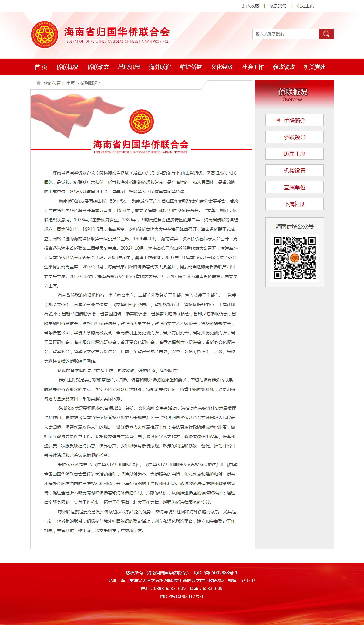 海南省归国华侨联合会(简称海南省侨联)是在中共海南省委领导下,由全省归侨、侨眷组成的人民团体,是党和政府联系广大归侨、侨眷和海外侨胞的桥梁和纽带,是全省性的一级人民团体,是省政协的组成单位。各级侨联与同级工会、青年团、妇联等人民团体享有同等待遇。