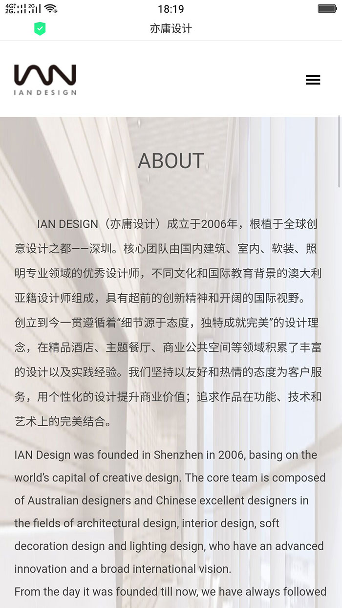IAN DESIGN(亦庸设计)成立于2006年,根植于全球创意设计之都——深圳。核心团队由国内建筑、室内、软装、照明专业领域的优秀设计师,不同文化和国际教育背景的澳大利亚籍设计师组成,具有超前的创新精神和开阔的国际视野。