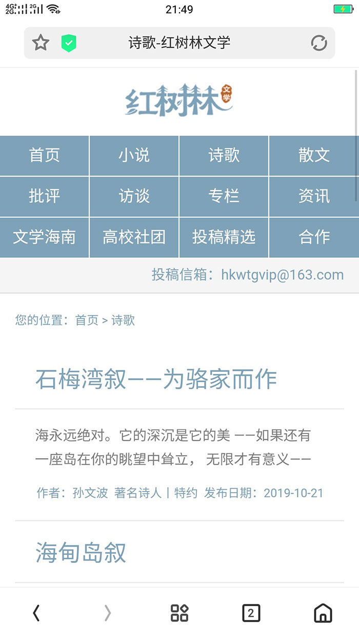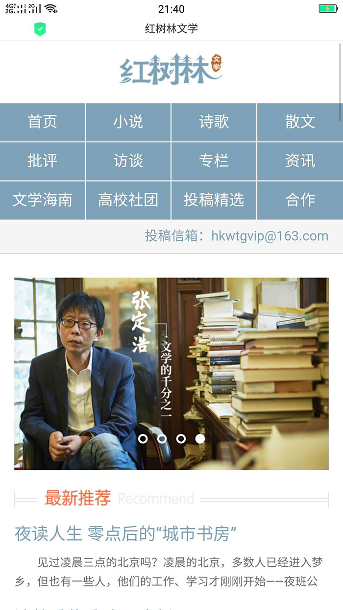 海口红树林文学频道由海口日报社海口网主办,是海口市最前沿、最核心的互联网文学平台。本频道于2019年10月改版,特开设“小说、诗歌、散文、文学批评、高校社团、投稿精选、资讯”等栏目。